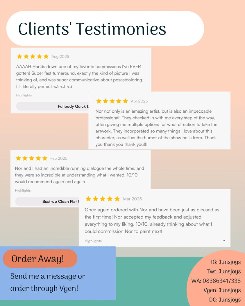 -I will send you progress of each stage (sketch, flat colors, rendering for drawings; rough recording, instrumentals, vocals for music) and you are free to revise how many times you want during those stages